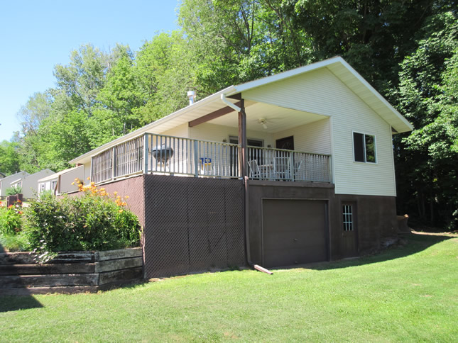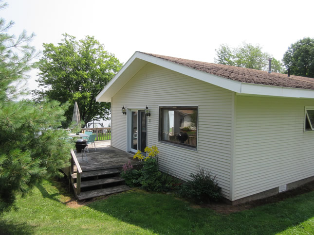 A modern 1100 square foot lakefront cottage with a wrap around deck. This unit has three bedrooms, one with a queen bed, one with a queen and a twin bed and one with 2 twin beds. It has two full baths, a gas fireplace, dishwasher, microwave a four person HOT TUB and CENTRAL AIR CONDITIONING